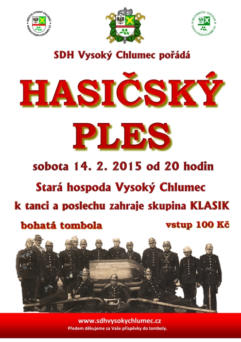 Hasičský ples SDH Vysoký Chlumec 14.02.2015 20:00 - Stará Hospoda Vysoký Chlumec - K tanci a poslechu zahraje KLASIK