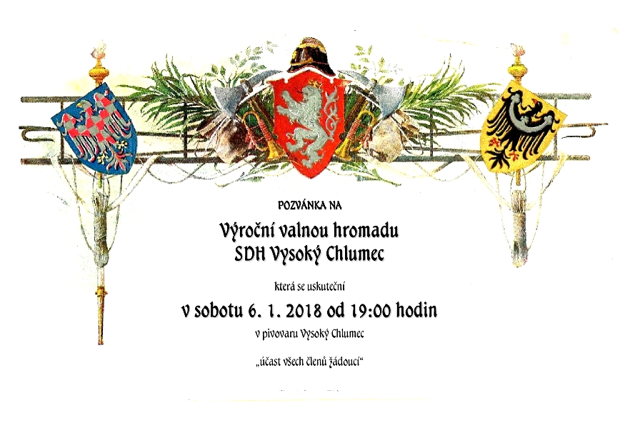 Výroční valná hromada SDH Vysoký Chlumec - sobota 6. 1. 2017 od 19 hodin.